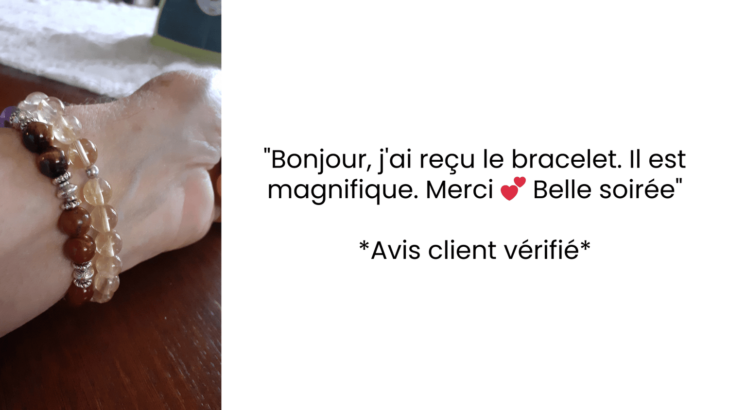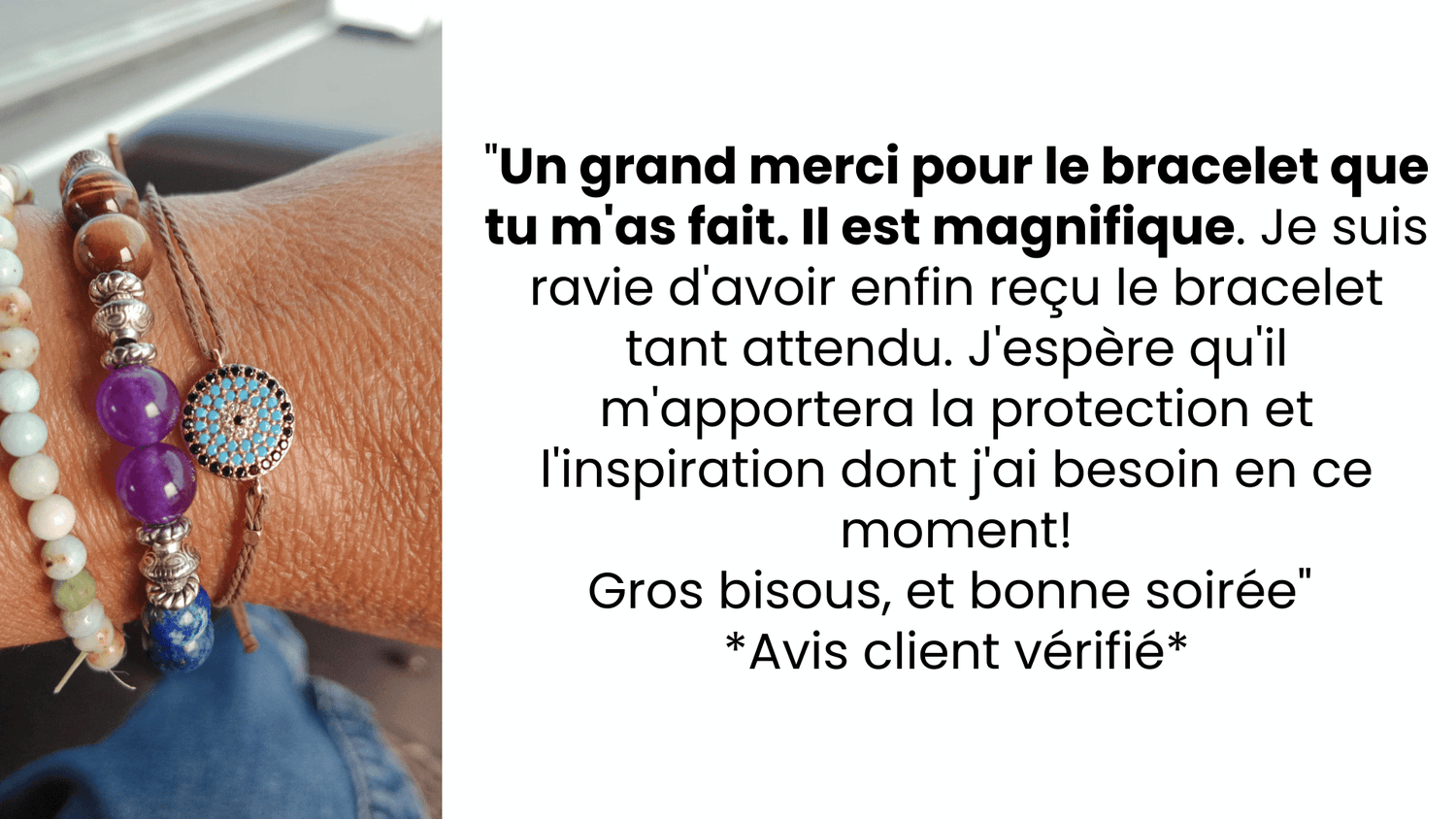 C’est simple : je suis tellement sûre de la qualité que si votre bracelet se casse, je m’engage personnellement à vous recréer un nouveau bracelet gratuitement à vous le renvoyer à mes frais.