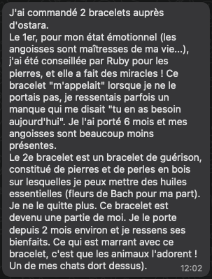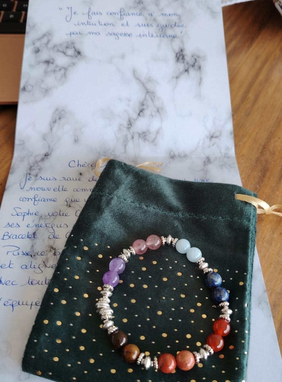 À la fin de ce processus, mes Guides Spirituels me transmettent un mantra puissant, que je prends soin d’écrire à la main et de glisser dans le colis avec votre bracelet.